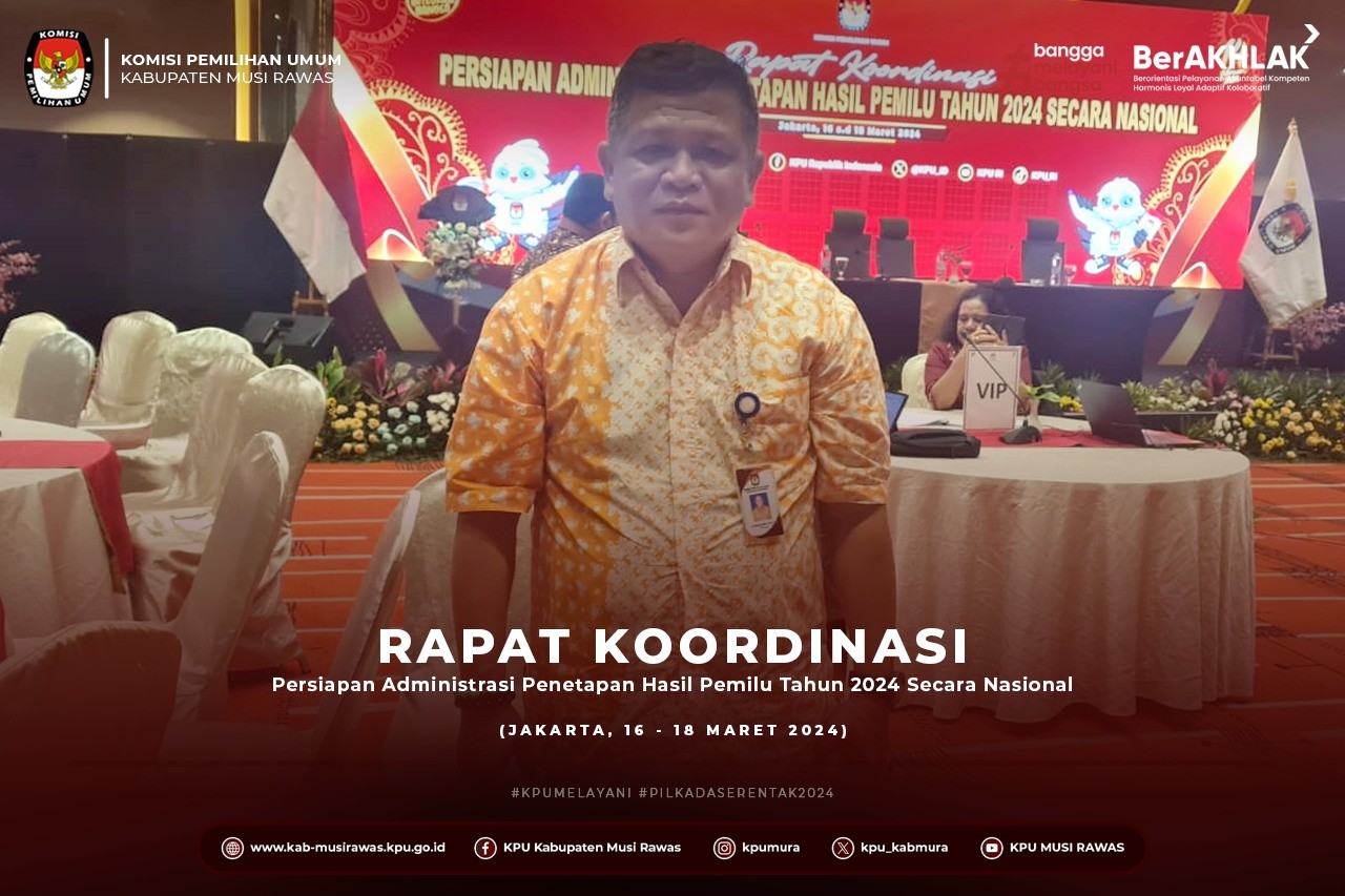#TemanPemilih, Sekretaris KPU Kabupaten Musi Rawas, Bapak H. Nailul Azmi, S.Psi., MM Menghadiri Rapat Koordinasi Persiapan Administrasi Penetapan Hasil Pemilu Tahun 2024 Secara Nasional yang berlangsung di Jakarta (16 - 18/3/2024) ..