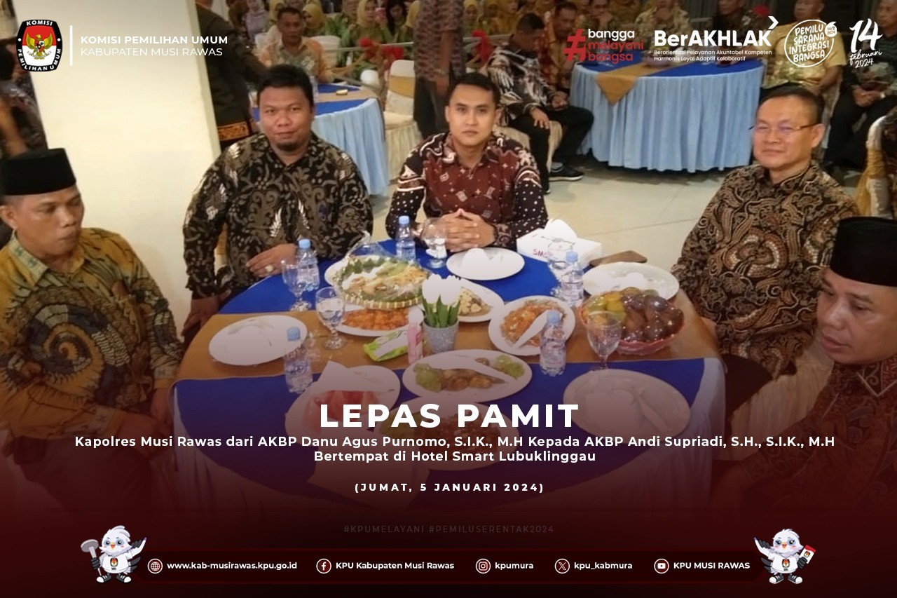 #TemanPemilih, KPU Kabupaten Musi Rawas Menghadiri Acara Lepas Pamit Kapolres Musi Rawas dari AKBP Danu Agus Purnomo..S.I.K.,M.H kepada AKBP Andi Supriadi,.S.H,.S.I.K,.M.H yang bertempat di Hotel Smart Lubuklinggau (5/1/2024) ..