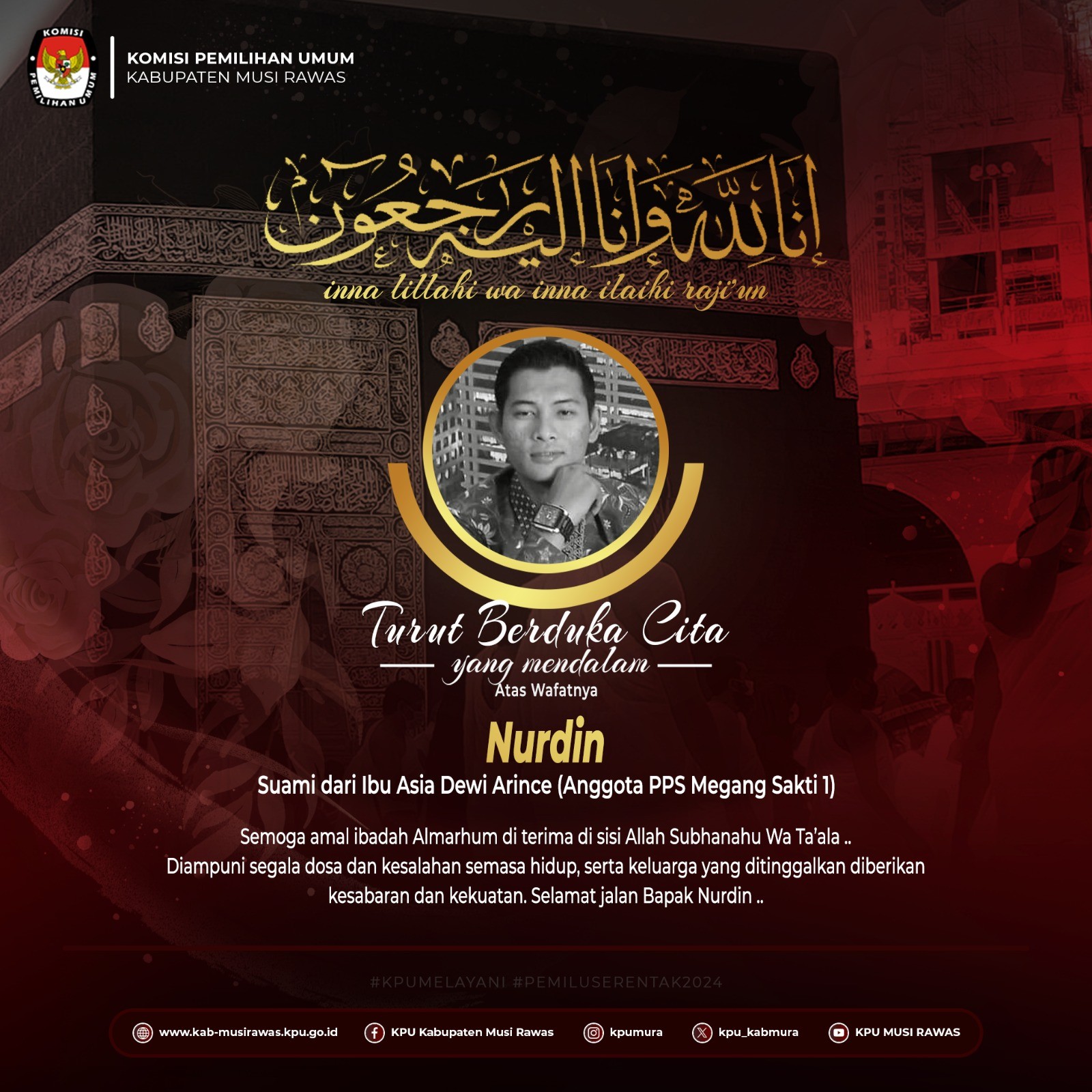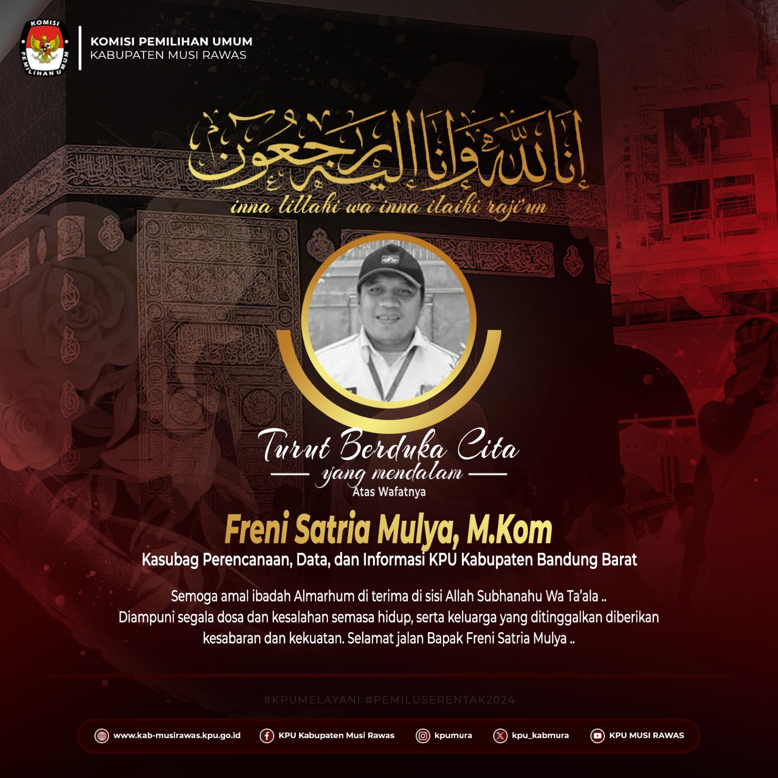 #TemanPemilih, segenap jajaran KPU Kabupaten Musi Rawas mengucapkan belasungkawa yang sebesar-besarnya atas meninggalnya Bapak Freni Satria Mulya, M.Kom (Kasubag Perencanaan, Data, dan Informasi KPU Kabupaten Bandung Barat)