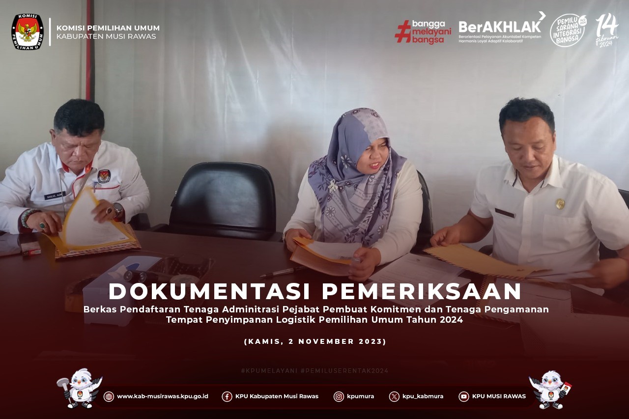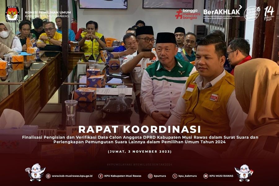 #TemanPemilih, KPU Kabupaten Musi Rawas Melaksanakan Rapat Koordinasi Finalisasi Pengisian dan Verifikasi Data Calon Anggota DPRD Kabupaten Musi Rawas dalam Surat Suara dan Perlengkapan Pemungutan Suara Lainnya dalam Pemilihan Umum Tahun 2024 bersama Partai Politik Peserta Pemilu Tahun 2024 di Kantor KPU Kabupaten Musi Rawas (3/11/2023) ..