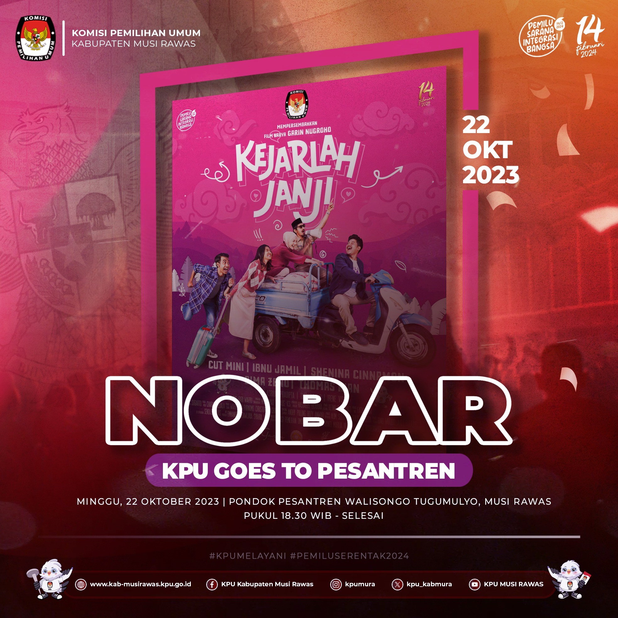 #TemanPemilih, KPU Kabupaten Musi Rawas mempersembahkan "KPU Goes to Pesantren", yang dimana KPU Kabupaten Musi Rawas akan melakukan pemutaran dan nonton bareng Film "Kejarlah Janji" yang bertempat di Pondok Pesantren Walisongo Tugumulyo, Kabupaten Musi Rawas pada hari Minggu, 22 Oktober 2023 mulai pukul 18:30 WIB .. .