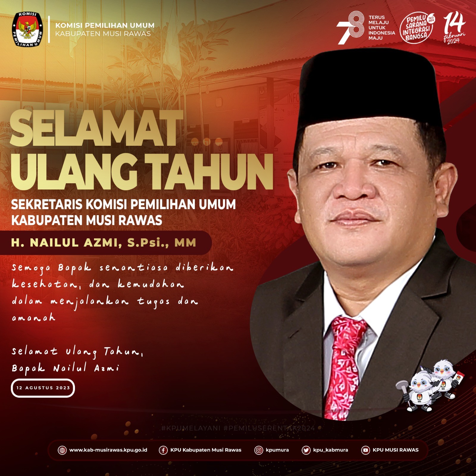 #TemanPemilih, segenap jajaran KPU Kabupaten Musi Rawas mengucapkan Selamat Ulang Tahun kepada Sekretaris KPU Kabupaten Musi Rawas, Bapak H. Nailul Azmi, S.Psi., MM..