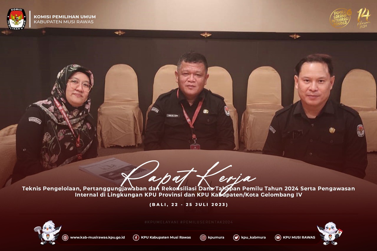 #TemanPemilih, Sekretaris, Kassubag Keuangan, Umum, dan Logistik, serta Bendahara Sekretariat KPU Kabupaten Musi Rawas mengikuti Rapat Kerja Teknis Pengelolaan, Pertanggungjawaban dan Rekonsiliasi Dana Tahapan Pemilu Tahun 2024 Serta Pengawasan Internal di Lingkungan KPU Provinsi dan KPU Kabupaten/Kota Gelombang IV yang berlangsung di Bali (22-25/7/2023) ..