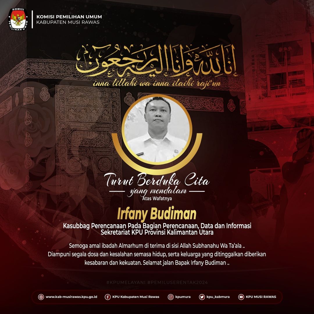#TemanPemilih, segenap keluarga besar KPU Kabupaten Musi Rawas mengucapkan duka cita mendalam atas meninggalnya Bapak Irfany Budmian (Kasubbag Perencanaan Pada Bagian Perencanaan, Data, dan Informasi Sekretariat KPU Provinsi Kalimantan Utara).. .