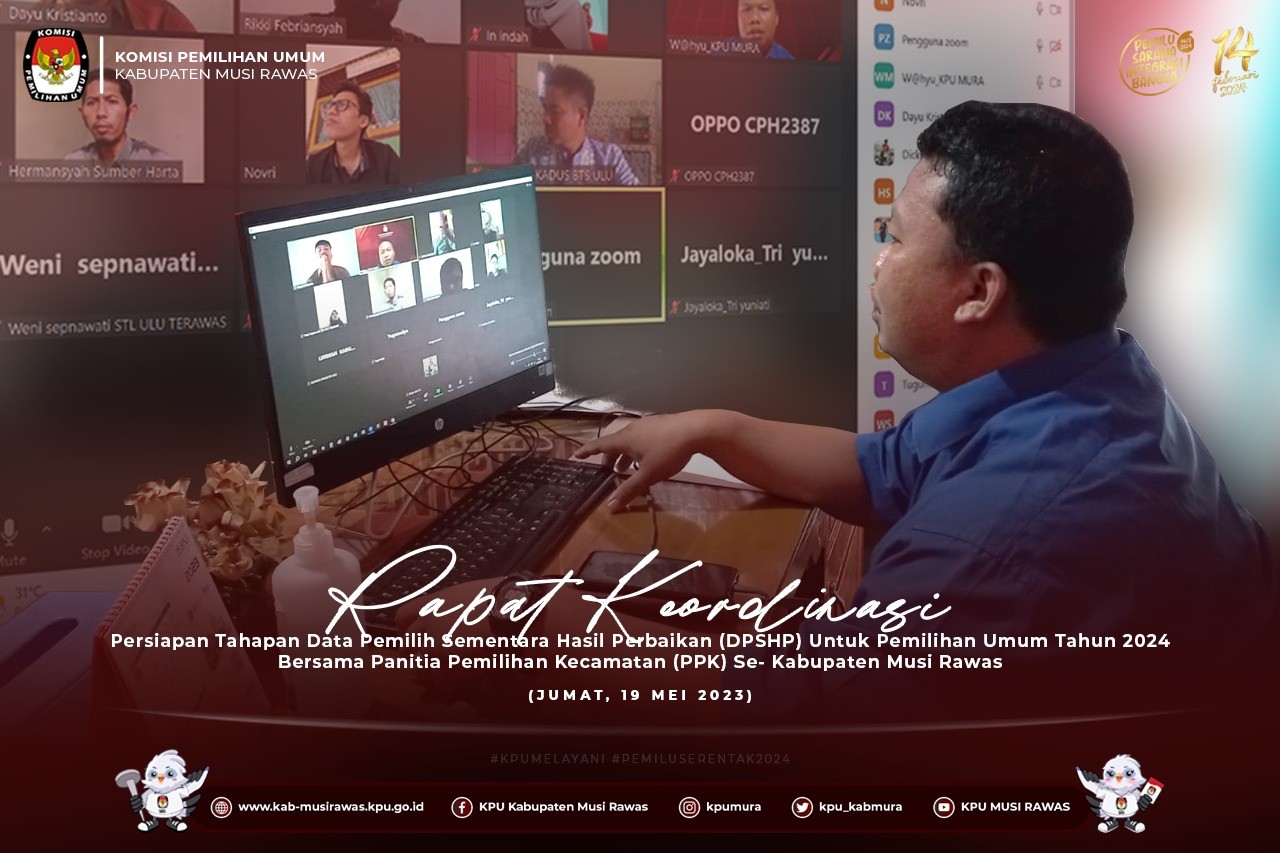 #TemanPemilih, KPU Kabupaten Musi Rawas mengadakan kegiatan Rapat Koordinasi "Persiapan Tahapan Data Pemilih Sementara Hasil Perbaikan (DPSHP) untuk Pemilu Serentak Tahun 2024 secara daring dengan Panitia Pemilihan Kecamatan (PPK) di wilayah Kabupaten Musi Rawas. Kegiatan ini diikuti oleh Anggota KPU Kabupaten Musi Rawas Divisi Perencsnaan, Data dan Informasi, Kasubbag Perencanaan Data dan Informasi serta Operator SiDalih KPU Kabupaten Musi Rawas.