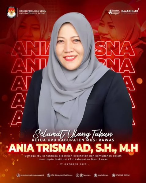 #TemanPemilih, segenap jajaran KPU Kabupaten Musi Rawas mengucapkan Selamat Ulang Tahun Ketua KPU Kabupaten Musi Rawas, Ibu Ania Trisna AD, S.H., M.H (27/10/2025) ..