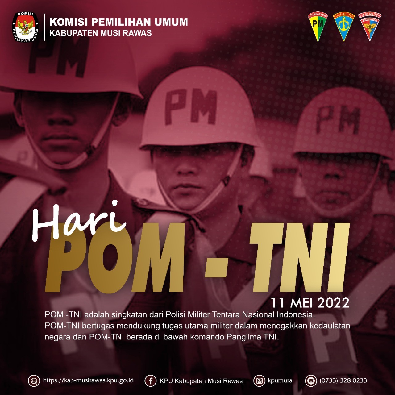 #TemanPemilih KPU Kabupaten Musi Rawas mengucapkan Selamat Hari POM=TNI 11 Mei 2022... Mengenal Hari POM TNI POM TNI dijelaskan dalam Peraturan Presiden RI Nomor 62 Tahun 2016 Tentang Perubahan Atas Peraturan Presiden Nomor 10 Tahun 2020 Tentang Susunan Organisasi Tentara Nasional Indonesia. Dalam Pasal 35A, disebutkan soal tugas dan struktur kepemimpinan di bawah POM TNI: Polisi Militer TNI disebut POM TNI bertugas membantu Panglima TNI dalam merumuskan kebijakan dan menyelenggarakan fungsi Kepolisian Militer guna mendukung pelaksanaan tugas pokok TNI. POM TNI dipimpin oleh Komandan POM TNI disebut Dan POM TNI berkedudukan di bawah dan bertanggung jawab kepada Panglima TNI, dalam pelaksanaan tugas sehari-hari dikoordinasikan oleh Kasum TNI. Dan POM TNI dibantu oleh Wakil Dan POM TNI disebut Wadan POM TNI. Sejarah di Balik Hari POM TNI Dilansir situs resmi TNI AD, sebelum Hari POM TNI diperingati, ada sejarah panjang di balik pembentukan Polisi Militer. Cikal bakalnya bermula pada 20 Maret 1948 di mana Wakil Presiden/Menteri Pertahanan Ad Interim mengeluarkan Penetapan Nomor : A/113/1948 tentang penghapusan beberapa badan Kepolisian Tentara yang ada dan sebagai penggantinya dibentuk Corps Polisi Militer (CPM) dengan Komandan Sementara adalah Kepala Staf Angkatan Perang Komodor Udara Suryadarma, yang membawahi 2 (dua) Komando Corps Polisi Militer Jawa (CPMD) yang membawahi 3 Batalyon dan Corps Polisi Militer Sumatera (CPMS) yang membawahi 5 Batalyon. Pada 31 Mei 1950, CPMD dan CPMS dihapus menjadi CPM dan markas besar yang semula berada di Yogyakarta dipindahkan ke Jakarta. Nama Markas Corps Polisi Militer kemudian diubah menjadi Markas Besar Polisi Militer. 360p geselecteerd als afspeelkwaliteit Pada 28 November 1950, ditetapkan 7 Batalyon Polisi Militer di seluruh Indonesia dan pembentukan Batalyon Rajasa, yang merupakan Satuan Khusus CPM yang dapat digerakkan dalam waktu cepat. Pada 6 Maret 1971, melalui Keputusan Menhankam Panglima ABRI Nomor : Kep/A/7/III/1971, ibentuklah organisasi Polisi Militer ABRI dan membawa dampak terhadap struktur organisasi Polisi Militer Angkatan Darat. Selanjutnya melalui Keputusan Kepala Staf TNI AD Nomor : Kep/45/II/1972 tanggal 5 Februari 1972 ditetapkan organisasi Dinas Provoost Angkatan Darat. Baca juga: Hari Lupus Sedunia 10 Mei 2022, Ini Serba-serbi Peringatannya Pada 4 Februari 1984 melalui Keputusan Panglima ABRI Nomor : Kep/04/P /II/1984 tentang Penyelenggaraan fungsi Kepolisian Militer di lingkungan ABRI dan Kepala Staf TNI AD Nomor : Kep/11/XII/1984 tanggal 17 Desember 1984 tentang pencabutan organisasi Dinas Provost TNI AD dan menetapkan menjadi organisasi Pusat Polisi Militer, yang pada saat itu mempunyai kewenangan dalam pelaksanaan tugas dan fungsinya terhadap ke tiga Angkatan (AD, AL, AU) dan Polri yang disebut Bina Tunggal. Di era reformasi (pasca pemisahan Polri dari organisasi TNI), Jenderal TNI Endriartono Sutarto mengeluarkan Keputusan Panglima TNI Nomor Kep/1/III/2004 tanggal 26 Maret 2004 tentang Penyelenggaraan Tugas dan Fungsi Kepolisian Militer di lingkungan TNI. Tugas dan fungsi kepolisian militer dilaksanakan di masing-masing korps, yaitu Polisi Militer TNI Angkatan Darat (POMAD), Polisi Militer TNI Angkatan Laut (POMAL) dan Polisi Militer TNI Angkatan Udara (POMAU) yang wewenang komando dan pengendalian operasional kepolisian militer berada pada Panglima TNI, dalam pelaksanaannya dilimpahkan kepada Kepala Staf Angkatan masing- masing. Di tingkat Mabes TNI sebagai pembantu dan penasehat utama Panglima TNI dalam bidang Kepolisian Militer dijabat oleh Perwira Tinggi TNI Bintang Dua, sebagai Perwira Staf Khusus POM (Passuspom) yang dalam hal ini dijabat oleh Danpuspomad. Pada 3 Mei 2015, Panglima TNI Jenderal TNI Moeldoko merombak struktur satuan Polisi Militer dari Staf Khusus POM TNI menjadi POM TNI sebagai upaya meningkatkan tata tertib dan penegakan hukum di lingkungan TNI. POM TNI berada langsung di bawah komando Panglima TNI, dan tidak lagi dilimpahkan ke masing-masing korps. Dikutip dari : Detik News #KPUMelayani #PemiluSerentak2024 #TNI