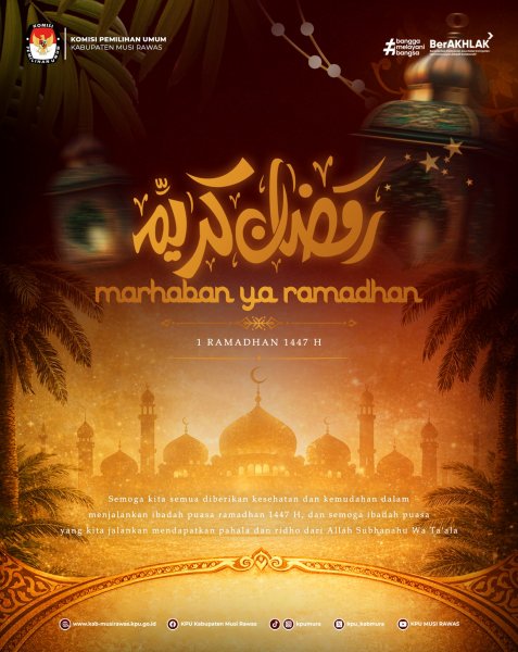 Kami segenap KPU Kabupaten Musi Rawas mengucapkan Selamat Menunaikan Ibadah Puasa. Semoga Ramadhan kali ini membawa kedamaian, keberkahan, dan kebahagiaan untuk kita semua.