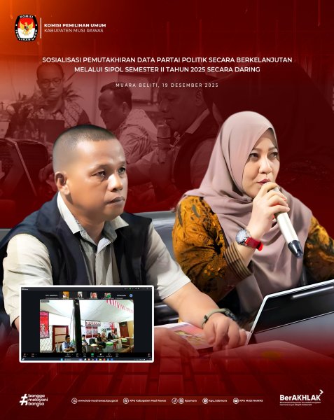#TemanPemilih , KPU Kabupaten Musi Rawas melaksanakan rapat rutin senin, yang dihadiri oleh Ketua KPU Kabupaten Musi Rawas Ibu Ania Trisna AD, Anggota KPU Bapak Zairinudin, Bapak Akhmad Sukur, dan Bapak Hengki Tornado, Sekretaris KPU Kabupaten Musi Rawas Bapak H. Nailul Azmi, serta seluruh staf KPU Kabupaten Musi Rawas (22/12/2025)