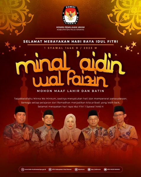 Allahu akbar, Allahu akbar, Allahu akbar Laa ilaaha illallaahu wallaahu akbar Allaahu akbar walillaahil hamd Sekretariat Komisi Pemilihan Umum Kabupaten Musi Rawas mengucapkan Selamat Hari Raya Idul Fitri 1446 H Taqabbalallahu minna wa minkum, shiyamana wa shiyamakum. Mohon maaf lahir dan batin kepada seluruh #TemanPemilih yang merayakan. Hari kemenangan telah tiba, membawa berkah dan kebahagiaan bagi kita semua. Semoga di momen yang penuh kehangatan ini, kita dapat mempererat silaturahmi, memperkuat persatuan, serta terus menjaga nilai-nilai demokrasi yang jujur dan adil. Mari bersama membangun bangsa yang lebih baik dengan semangat kebersamaan dan kedamaian. Selamat merayakan Idulfitri bersama keluarga dan orang-orang tercinta. KPUMelayani ------------------------------------- Find Us On: Facebook: KPU Kabupaten Musi Rawas Instagram: kpumura Tiktok: KPU MUSI RAWAS Youtube: KPU MUSI RAWAS Twitter: KPU Kabupaten Musi Rawas Website: https://kab-musirawas.kpu.go.id. Alamat: Jl. Lintas Sumatera Lahat-Lubuklinggau, Ps. Muara Beliti, Kabupaten Musi Rawas, Sumatera Selatan 31661