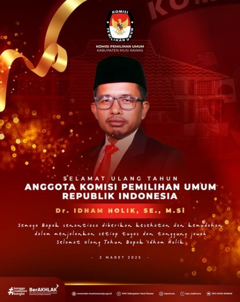 #TemanPemilih, segenap jajaran KPU Kabupaten Musi Rawas mengucapkan selamat ulang tahun kepada Bapak Dr. Idham Holik, SE., M.Si (Anggota KPU Republik Indonesia) ..